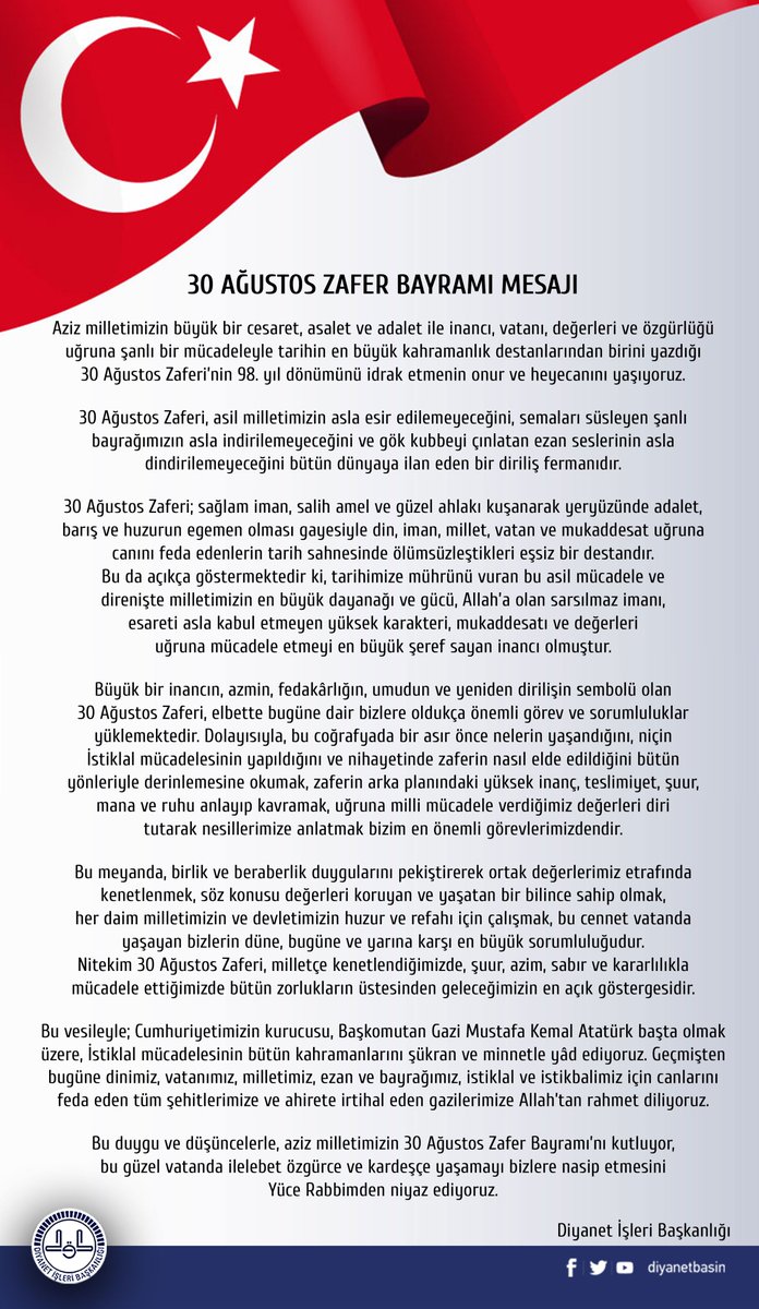 Diyanet On Twitter 30 Agustos Zafer Bayrami Mesaji 30 Agustos Zaferi Milletce Kenetlendigimizde Suur Azim Sabir Ve Kararlilikla Mucadele Ettigimizde Butun Zorluklarin Ustesinden Gelecegimizin En Acik Gostergesidir Https T Co Rmqxc0su4f Https