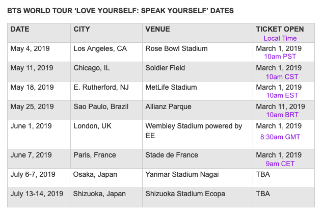 Jp On Twitter Bts Stadium World Tour Love Yourself Speak Yourself Info Ticket Sale Dates And Times The Times For Ticket Sales Are In Local Time Https T Co 2lvfprojl6